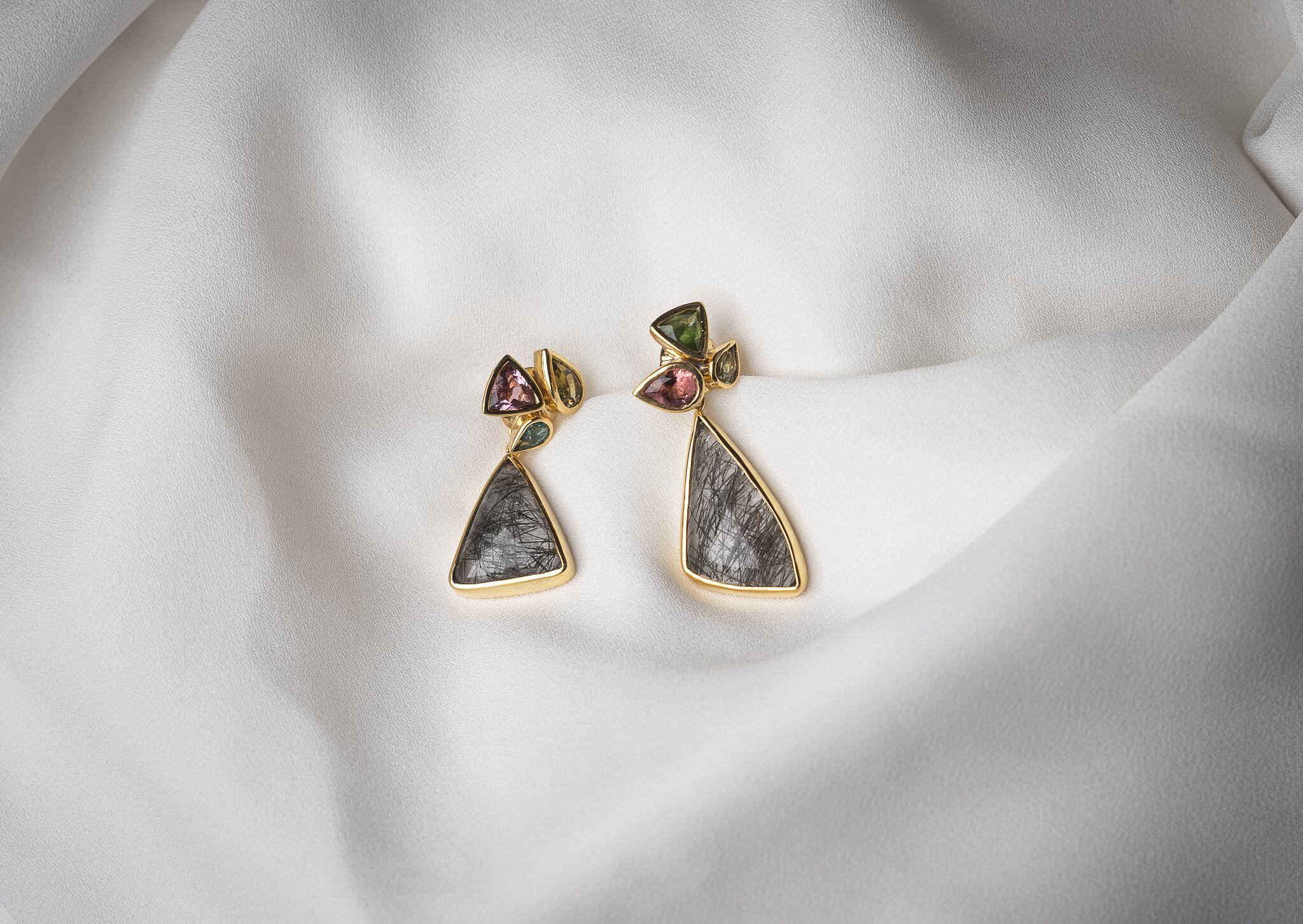 ブラックルチル、ガーネット、トルマリン、シトリン 2-in-1 ピアス